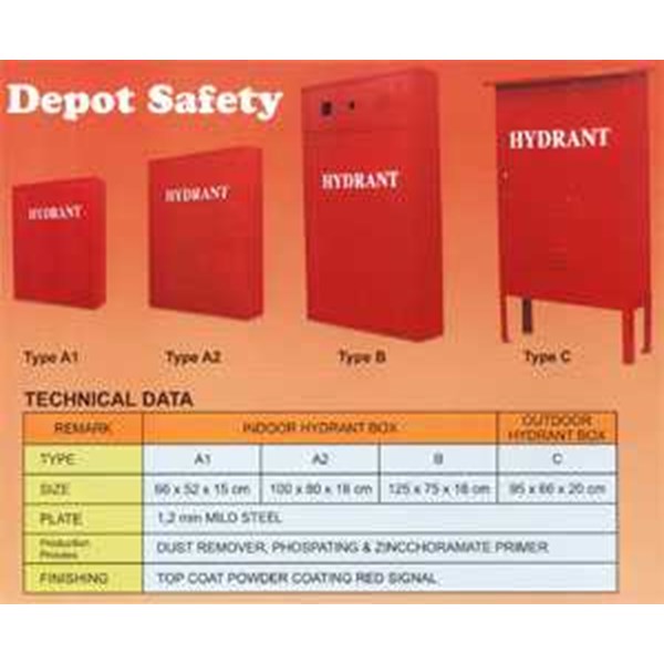 Hydrant Box / Box Hydrant Merk " HOOSEKI " Untuk Hydrant Type A1, A2 dan B biasa digunakan untuk di dalam ruangan dan Hydrant untuk Type C digunakan untuk diluar ruangan Brand: Hooseki Product Type: A1, A2, B, C Product Features: Dust remover, Phospating & zincchoramate primer, top coat powder coating red signal Product Specification: A1: 66x52x15cm, A2: 100x80x18cm, B: 125x75x18cm, C: 95x66x20cm